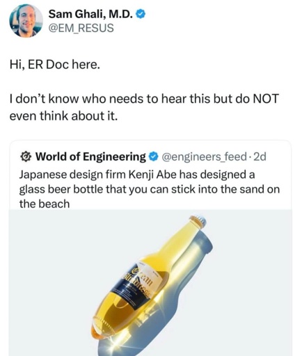Yeah what I mean is for me it doesn’t really matter, I am not going to break a bottle, and even if I accidentally did (not really sure how at the beach in soft sand) I would clean up the glass pieces. Broken bottles at the beach are left by assholes, not by accident.
